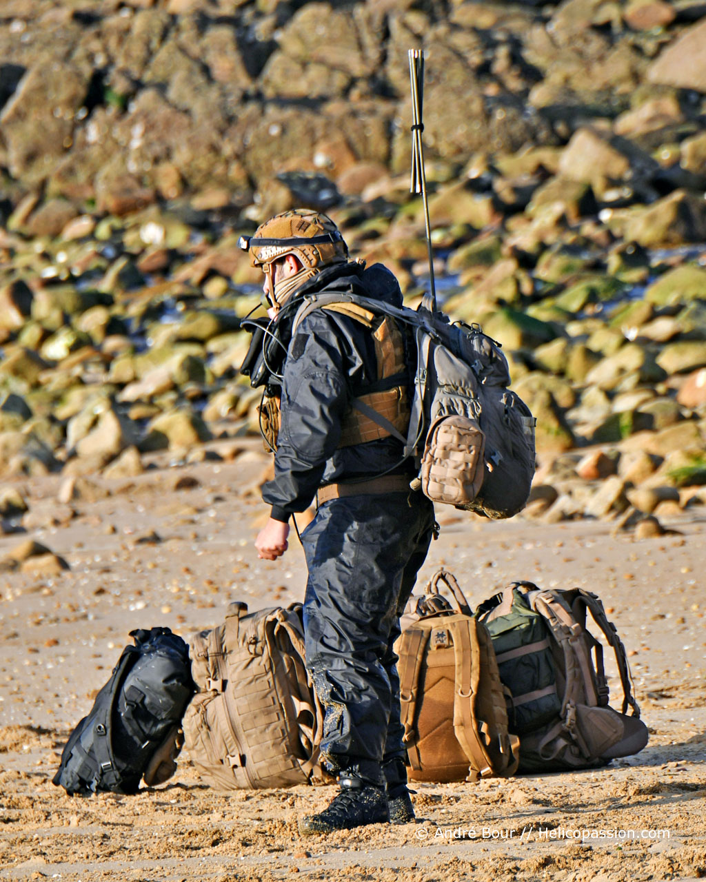 Depuis la plage, un fusilier marin rend compte par radio au PHA des conditions constatées sur le terrain