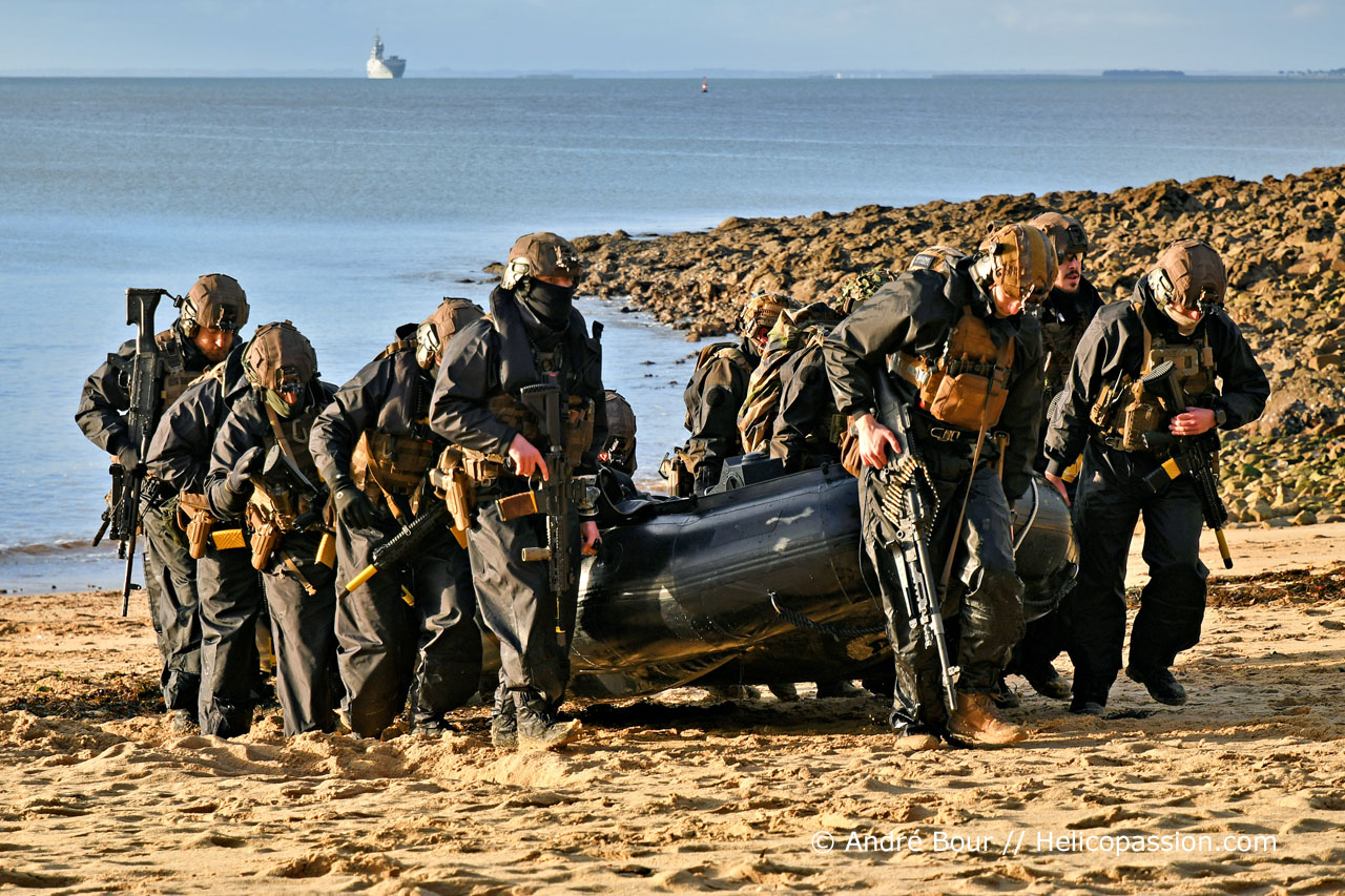 Un NH90 Caïman projette des commandos en avant du dispositif amphibie afin de sécuriser des points clés et couvrir la mise à terre