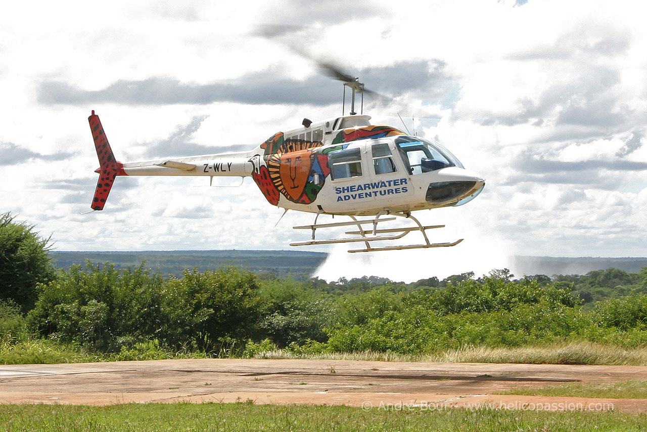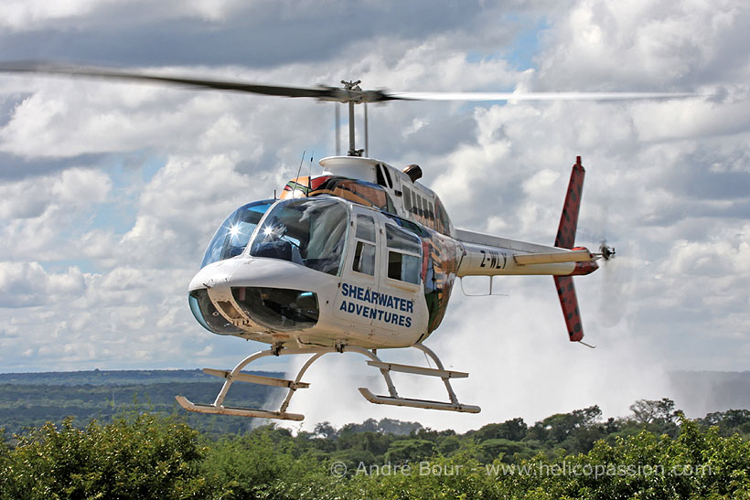 Photos du BELL 206B JetRanger III de SHEARWATER, avec en arrière plan l'énorme nuage d'eau soulevé par les chutes Victoria