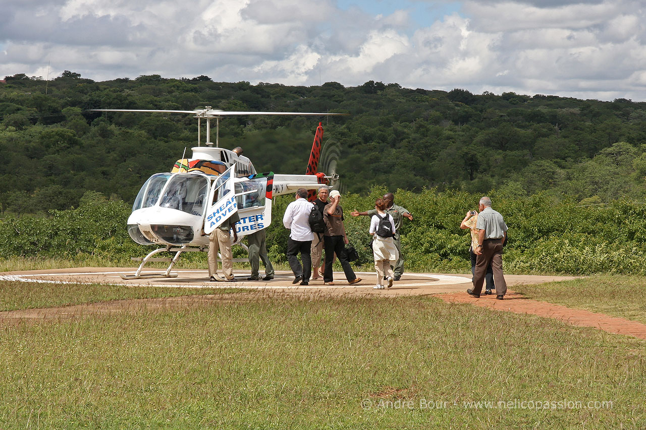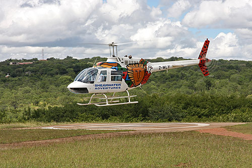 L'hélicoptère BELL 206B JetRanger III de SHEARWATER au retour du survol des chutes Victoria, avec la très belle décoration reprenant le logo de SHEARWATER