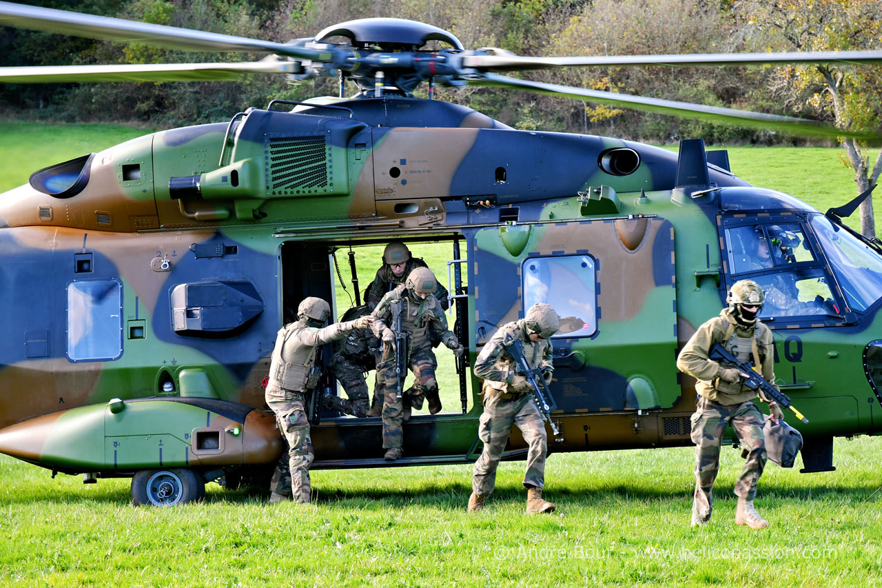 Arrivée de l'hélicoptère NH90 Caïman EAQ à proximité du village de Pressat, avec 20 militaires à son bord