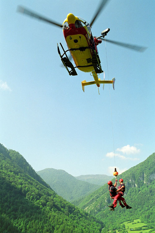 Hélitreuillage d'un binôme. La capacité du treuil permet d'hélitreuiller 2 personnes à la fois