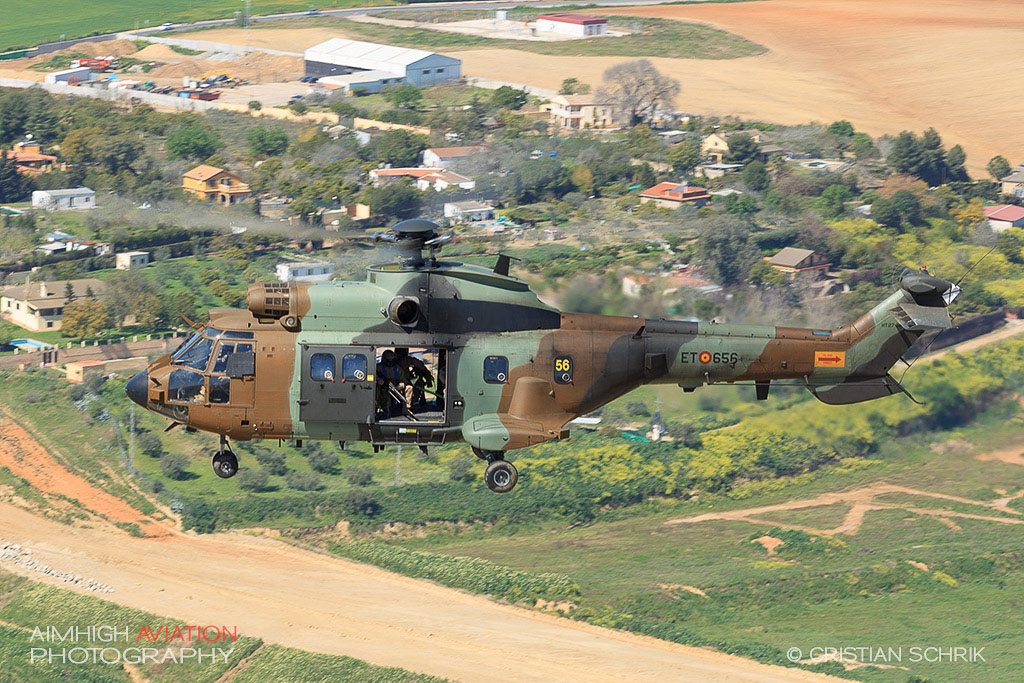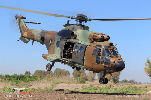 Hélicoptère AS532UL Cougar (HT27) de la FAMET (Fuerzas Aeromoviles del Ejercito de Tierra) espagnole. L'appareil est opéré par le bataillon d'hélicoptères de manoeuvre BHELMA IV (Batallon de Helicopteros de Maniobra) stationné à Ol Copero au sud de Sévile. Les hélicoptères de BELMA IV ont été engagés en Afghanistan, en Irak, au Kosovo, au Liban et au Kyrgyzstan