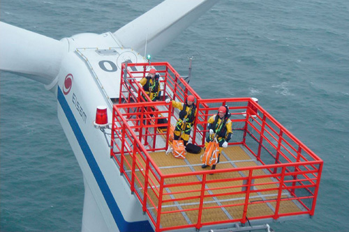 Fonctionnement d'un parc éolien en mer, l'hélicoptère hélitreuille les équipes de maintenance sur les nacelles des éoliennes