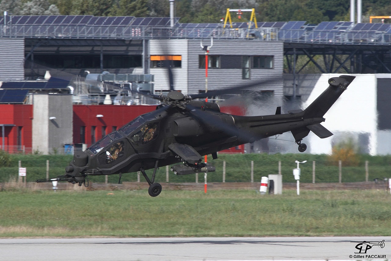 Hélicoptères AB205 et A129 Mangusta de l'armée italienne en escale ravitaillement à Chambéry le 12 octobre 2013, en route pour Etain, pour un échange d'une semaine avec le 3e RHC de l'ALAT française