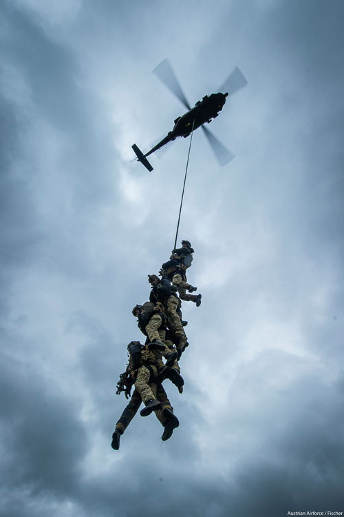 Descente en corde lisse à partir d'un UH60 Blackhawk autrichien