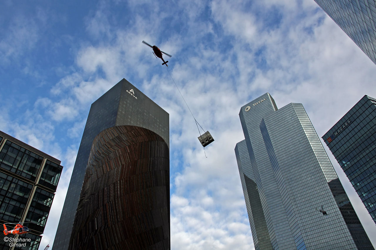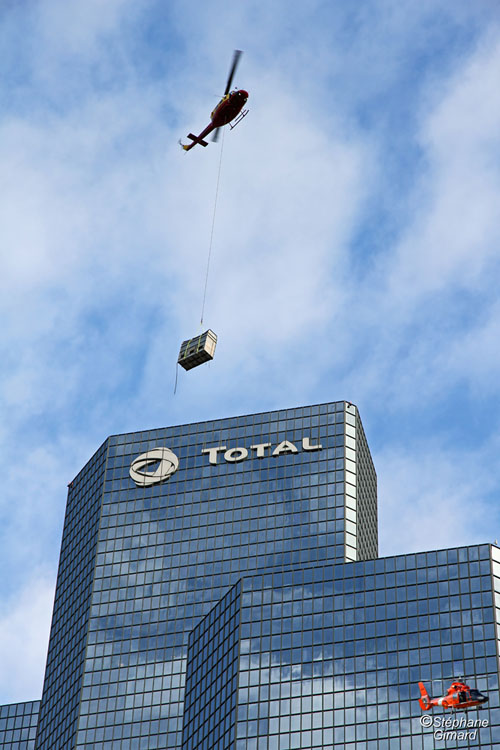 L'hélicoptère Bell 212 est arrivé vers 9h30 sur le parvis de La Défense. Ils ont changé de pilote, mis l'élingue en place et enlevé les portes à l'avant. Puis l'hélicoptère a décollé vers 10h30 pour commencer les rotations entre le bas de la tour Total, et le sommet, 180 mètres plus haut. Quasiment à chaque rotation il montait une charge, puis en descendait une autre. C'était des poutres, des caisses, des tuyaux...