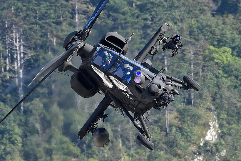 Le canon de l'A129 vise une cible au sol, prêt à tirer