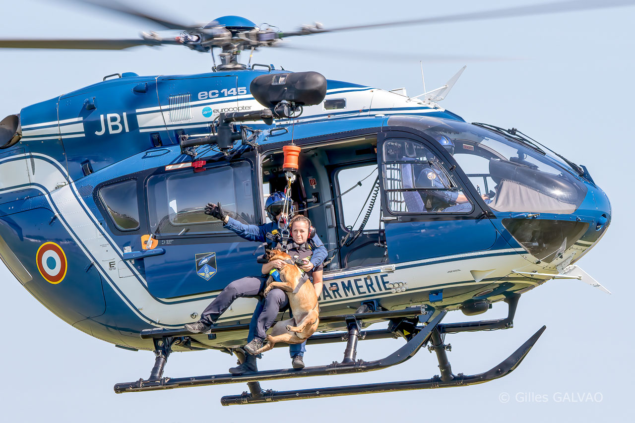 Hélitreuillage d'un binôme K9 par un hélicoptère EC145 de la Gendarmerie Nationale