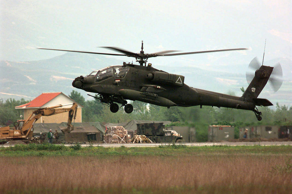 24 Apache sont déployés en Albanie depuis l'Allemagne, à grand renfort médiatique et de guerre psychologique (parachutage de tracts "les Apache arrivent..."). Les premiers Apache arrivent à Tirana le 21 avril 1999. Puis cela tourne à la catastrophe avec 2 crashs successifs lors de vols d'entrainement de nuit : un premier le 26 avril 1999, un second mortel le 5 mai 1999. Ces 2 accidents portent à 50 le nombre de crash d'Apache, avec 14 pilotes tués, depuis sa mise en service. Par la suite on parlera du manque d'entrainement des pilotes au vol de nuit en JVN et à haute altitude. A moins que ces 2 "accidents" ne fassent suite à une contre-attaque de l'aviation serbe le 26 avril sur l'aéroport de Tirana, comme l'avancent certaines sources non officielles ? Au final, les Apache n'auront pas été engagés !
