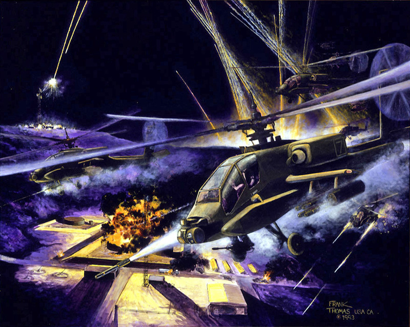 Le 17 janvier 1991. 8 Apache, conduit par 2 MH53J Pavelow III s'enfoncent de nuit à 720 km en territoire irakien. Leur mission : détruire deux stations de radar. Chaque Apache est armé de 4 missiles Hellfire, de 2 pods roquettes et d'un réservoir extérieur. Ils passent la frontière vers 2h15 et arrivent sur leurs cibles vers 2h38. 27 Hellfire, 100 roquettes et 4000 tirs de canon sont tirés. La voie aérienne vers Bagdad est ouverte aux F117. Au retour, ils sont ravitaillés en carburant en territoire irakien par des CH47 Chinook.