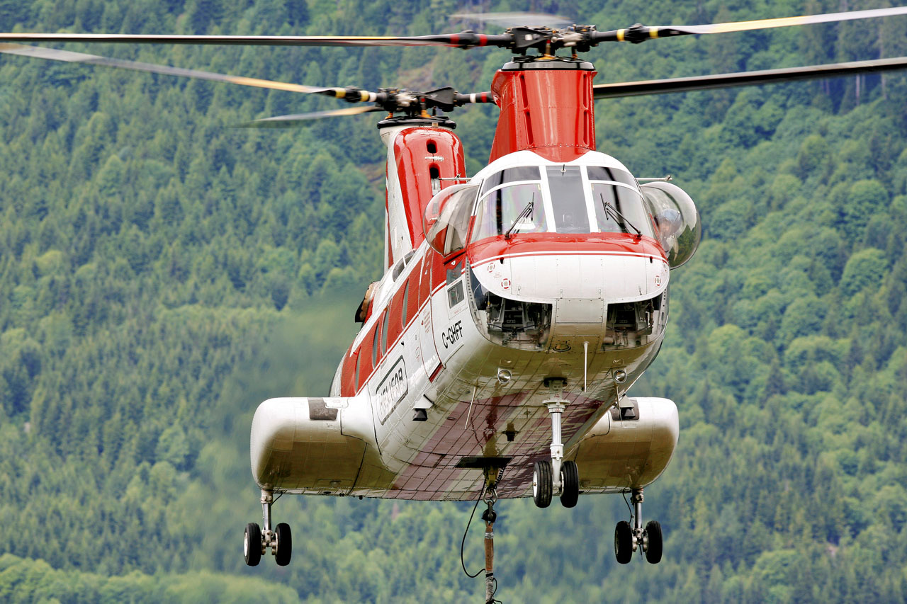 Après leur retrait de service dans les armées, les CH46 Seaknight ont connu une seconde vie dans le travail aérien. Ici un appareil de la compagnie HELIFOR, intégrée depuis à Columbia Helicopters