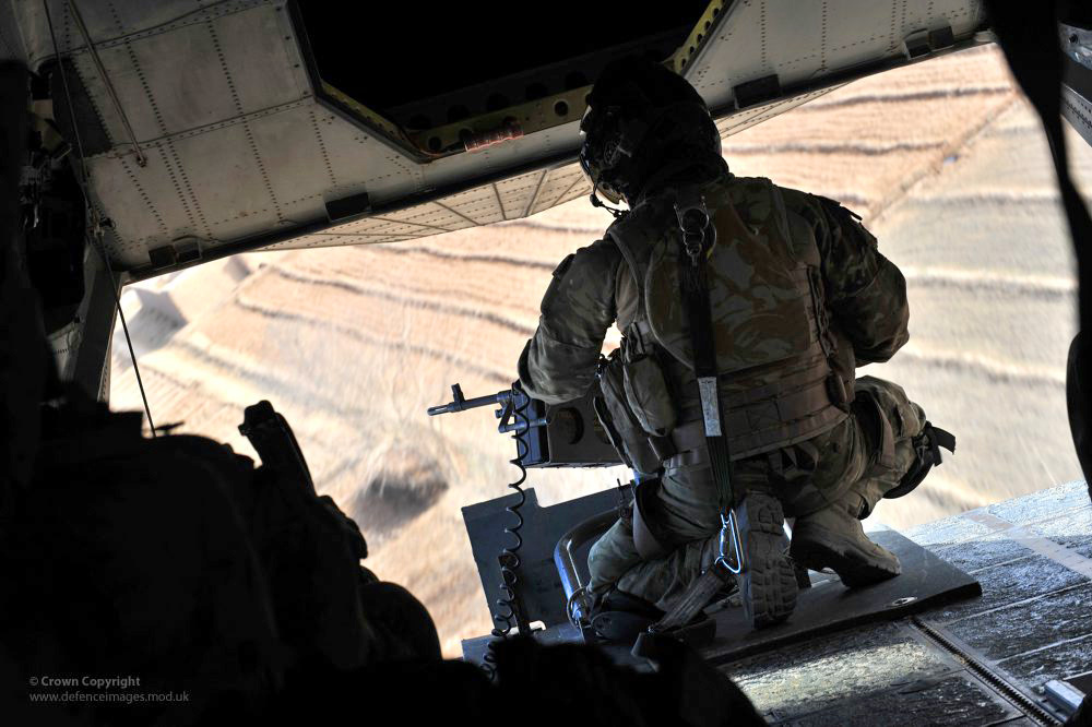 Les EH101 Merlin engagés en Afghanistan sont armés de 2 mitrailleuses de sabord et d'une mitrailleuse sur la rampe arrière
