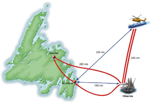 Le Cormorant décolle à 11h du matin de sa base de Ganger pour rejoindre la plate-forme pétrolière Hibernia (280 nm = 518 km), il effectue alors l'aller-retour (2 x 200 nm = 2 x 370 km) vers le navire dans des conditions très difficiles : vent violent, grande partie du vol dans la nuit, basse température nécessitant le dégivrage des pales.