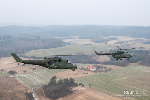 Patrouille d'hélicoptères MI24 Hind D de l'armée polonaise en Afghanistan. L'un des appareils emportent 2 pods canon de 23 mm (avec 250 obus), l'autre 2 pods de 32 roquettes de 57 mm