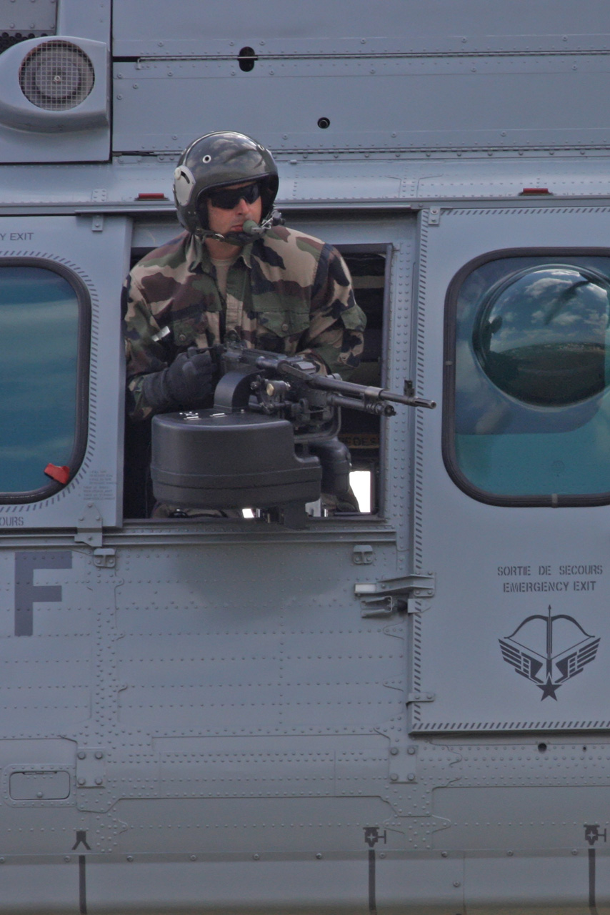 Canon de 20 mm sur un hélicoptère SA330 Puma "Pirate". Ce canon a une portée de 1500 mètres, une cadence de 700 coups/minute, avec un emport de 4 x 240 obus