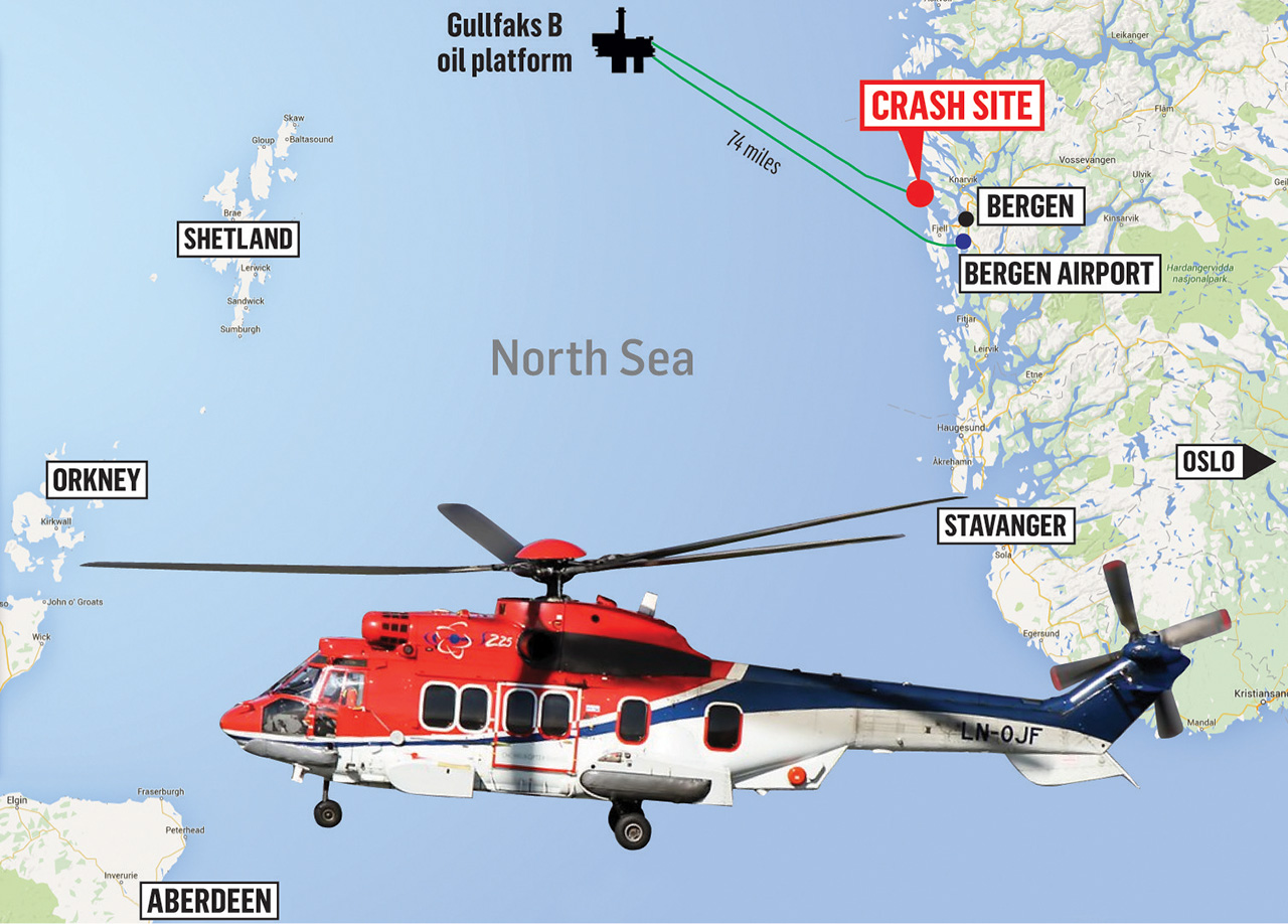 Le 29 avril 2016, un hélicoptère EC225 de la société CHC de retour d'une plate-forme en mer du Nord, au large de la Norvège, s'est écrasé près de la côte à l'approche de Bergen. Des vidéos montrent le rotor principal, détaché de la cabine, tombant au sol. L'appareil transportait 13 personnes, 11 corps ont été retrouvés dans la cabine sous 5 mètres d'eau. Le rotor principal a été retrouvé à terre. La révision technique de l'appareil aurait été repoussé par 2 fois.
