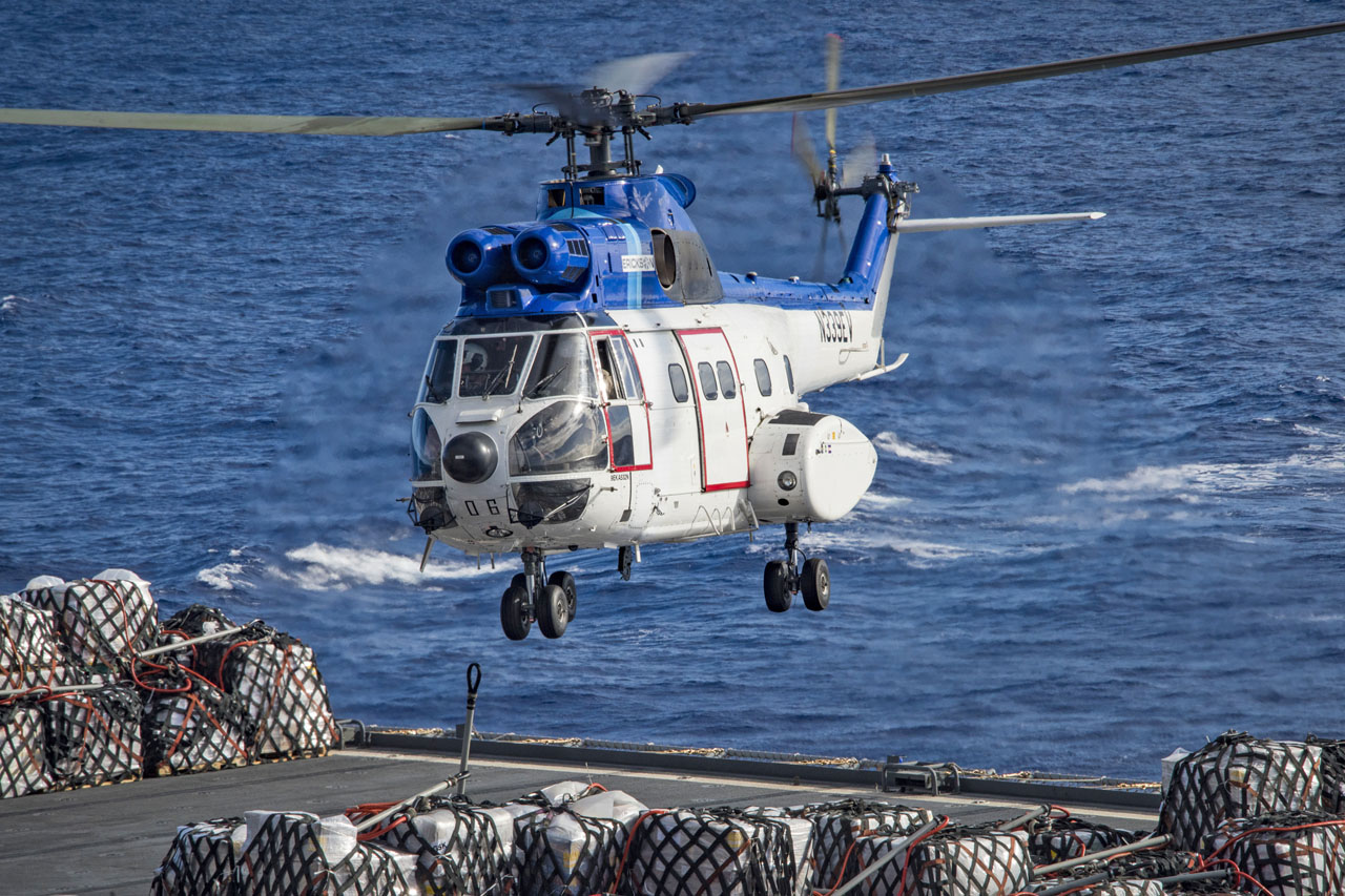 Hélicoptères SA330 Puma, opéré par Erickson, en opération de ravitaillement en mer d'un navire de l'US Navy, le 26 janvier 2018