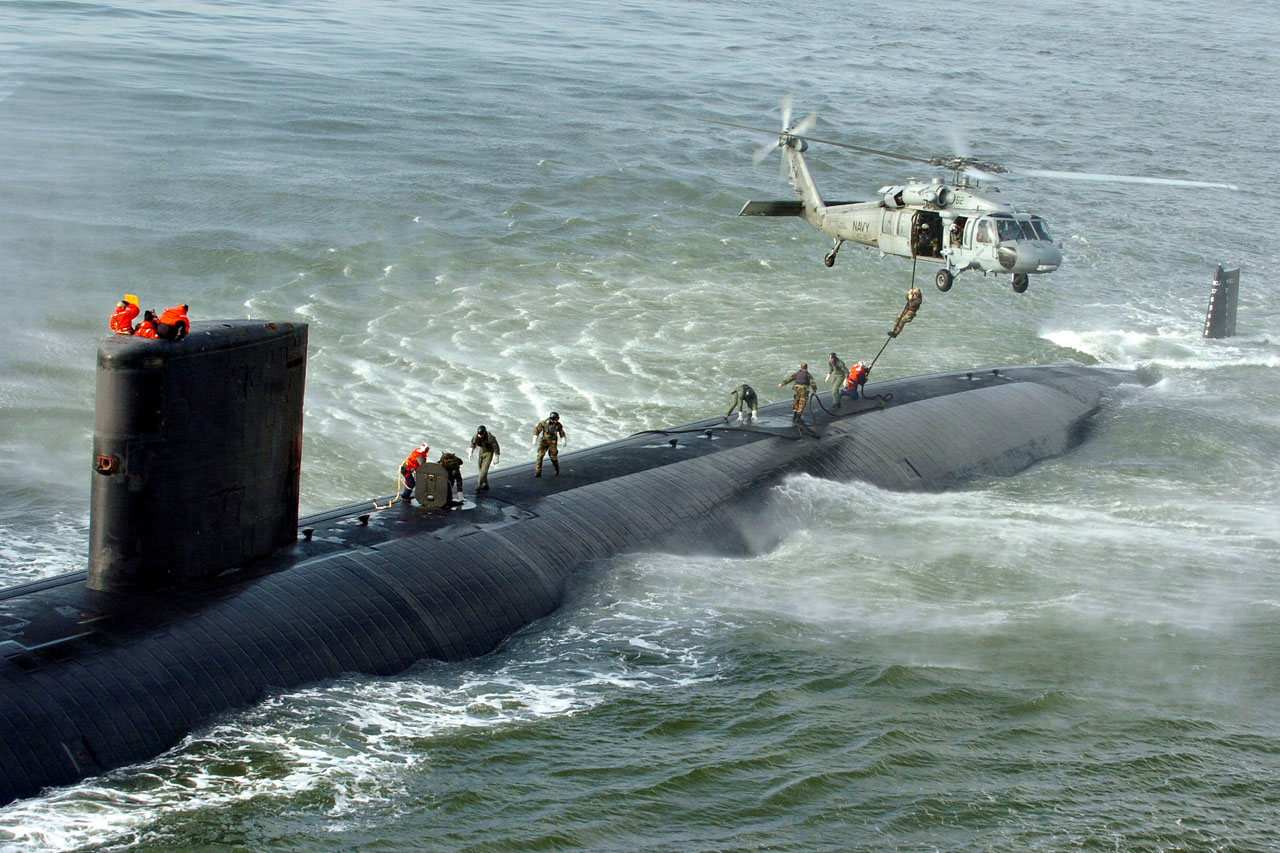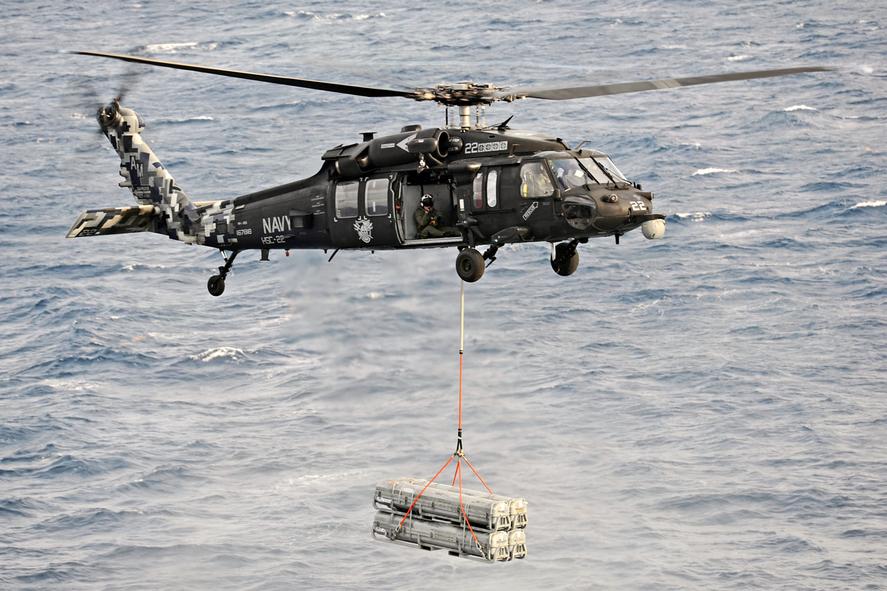 Un hélicoptère MH60S de l'US Navy, équipé du kit d'armement (Armed Helo Mission Kit) avec des missiles Hellfire et 4 mitrailleuses de porte