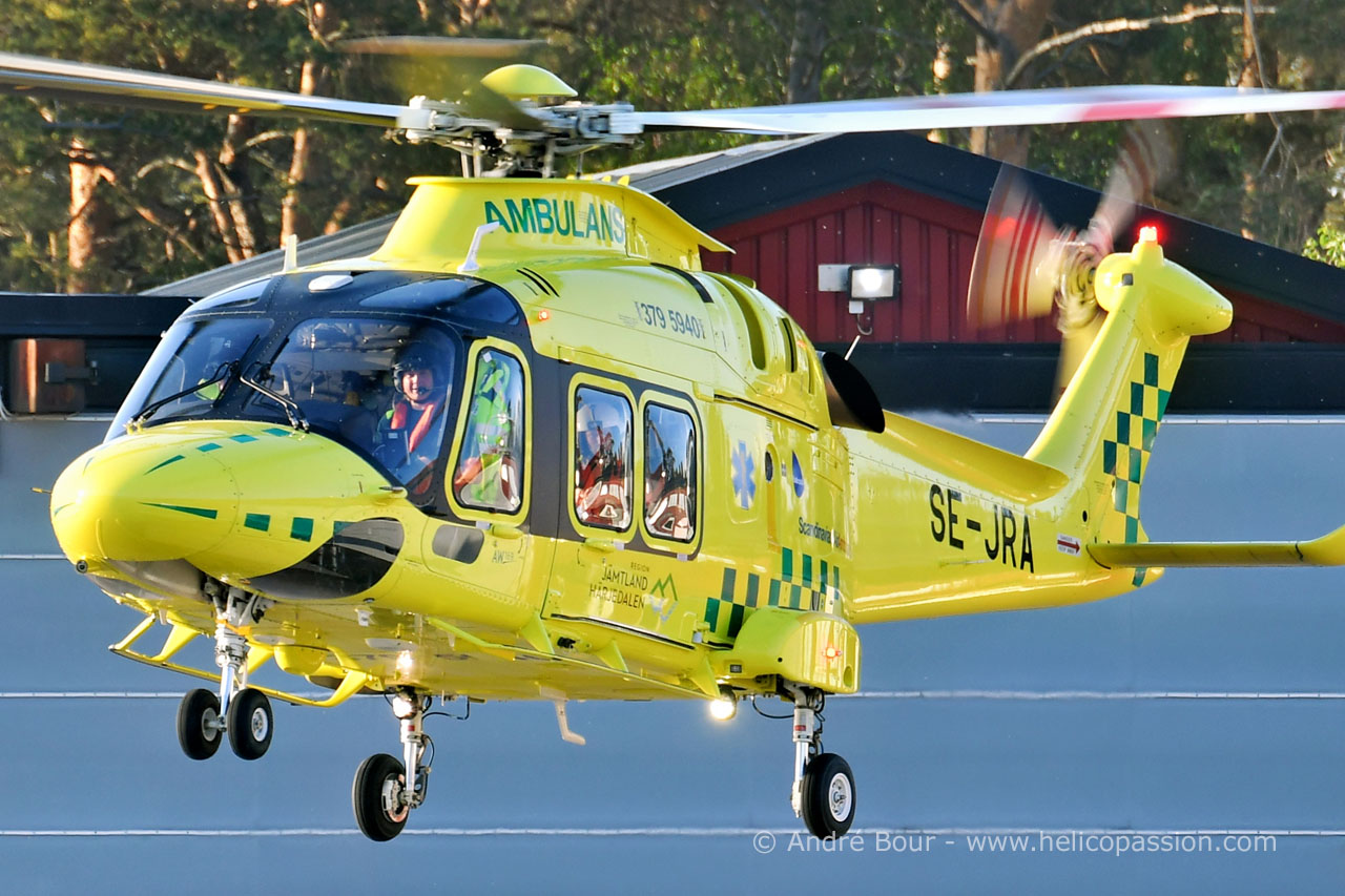 Hélicoptère AW169 SE-JRA de Babcock Scandinavian Air Ambulance, à Östersund, en Suède, le 8 juin 2019. 3 autres AW169 sont basés à Gällivare, Lycksele et Gothenburg