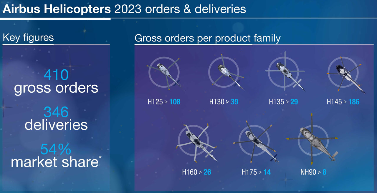 En 2023, Airbus Helicopters a enregistré 410 commandes brutes (393 nettes). Les commandes proviennent de 179 clients de 47 pays. La société a livré 346 hélicoptères en 2023, ce qui représente une part de 54 % du marché civil et parapublic.