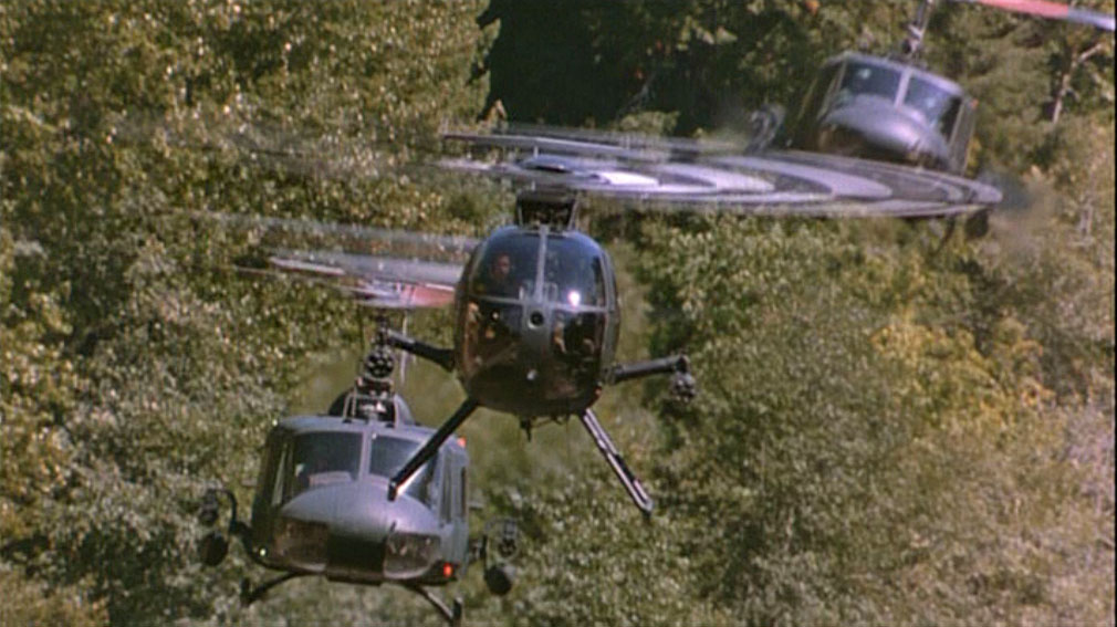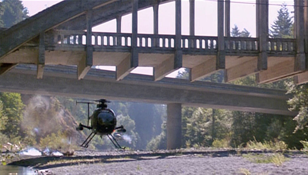 Dans Alerte ! (1995), le final met en scène un duel aérien entre l'OH6 du héros et deux Huey de l'armée. Vols en rase-mottes dans le lit d'une rivière, virages serrés et tension maximale font de cette poursuite le point culminant du film.