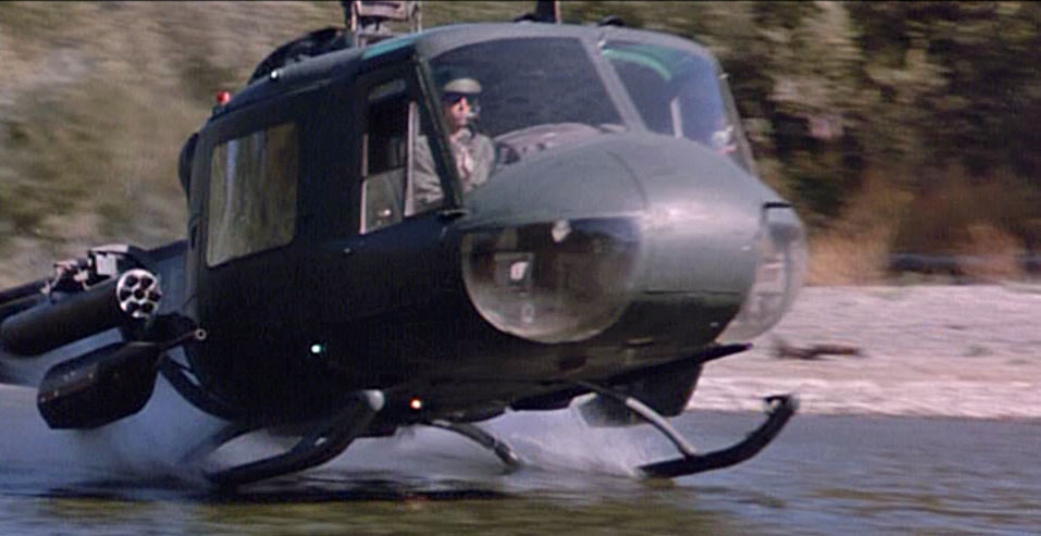 Dans le film Rambo II, un hélicoptère UH1 Huey et un MI24 Hind s'affronte dans un canyon...