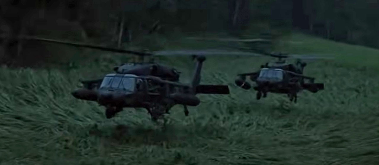 Danger Immédiat (1994) comporte une scène d'infiltration nocturne de commandos à bord de deux UH60 Blackhawk - équipés d'ailerons avec des réservoirs supplémentaires - volant au ras de la jungle colombienne. Filmés en silence, lumières éteintes, ils glissent au-dessus du relief dans une chorégraphie parfaitement coordonnée. Cette insertion furtive, tendue et réaliste, fait des hélicoptères de véritables acteurs de l'action, illustrant à la fois la précision des opérations spéciales et la vulnérabilite qui mènera à l'embuscade suivante.