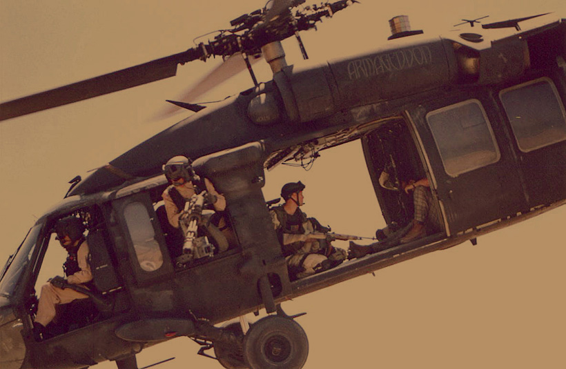 Un hélicoptère Blackhawk survole le convoi en route vers Mogadishu