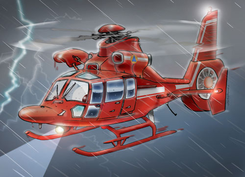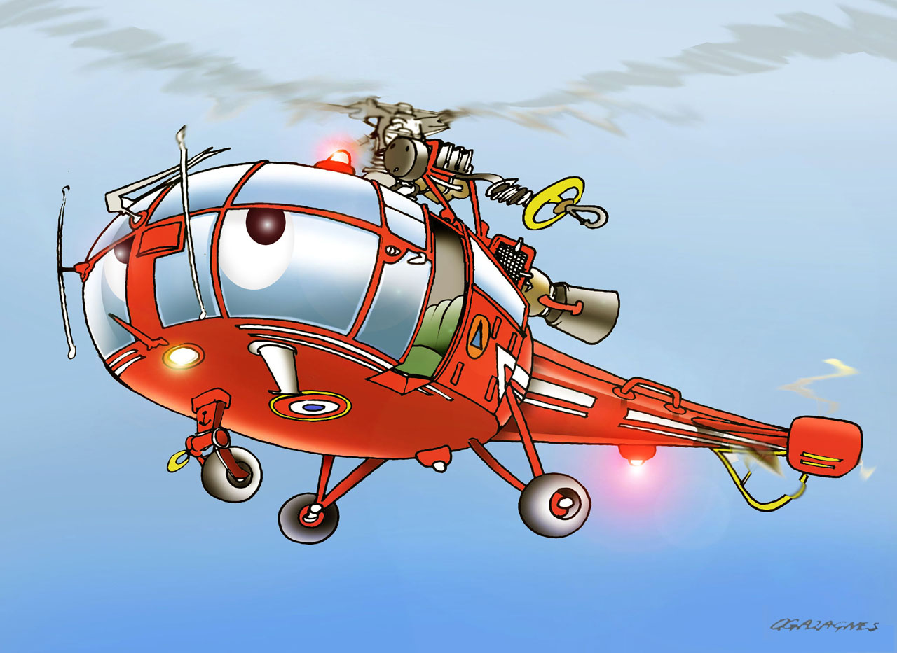 Caricatures d'hélicoptères par Olivier GAZAGNES : Alouette III, EC145, Ecureuil et Dauphin de la Sécurité Civile, EC135 Gendarmerie