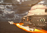Galerie de peintures - Daniel BECHENNEC Guerre du Golfe, un hélicoptère AS565 Panther d'Arabie Saoudite tire un missile AS15 |